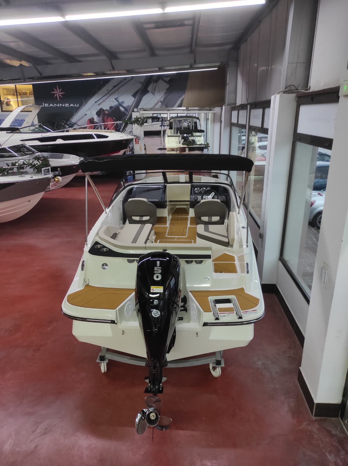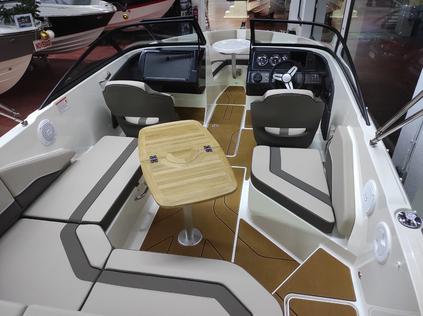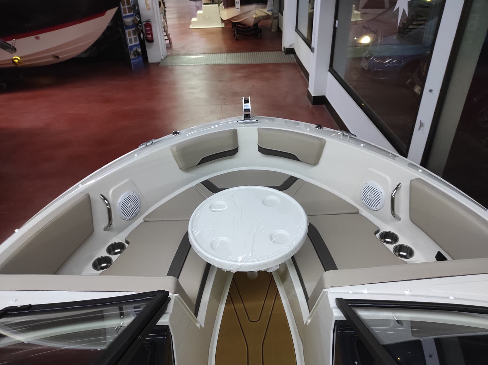 Equipada con motor Mercury 150 Hp, tiene una comodísima bañera, varios rincones de estiba, plataforma de baño y un parabrisas envolvente. Solarium en proa, convertible tambien en mesa de comedor.