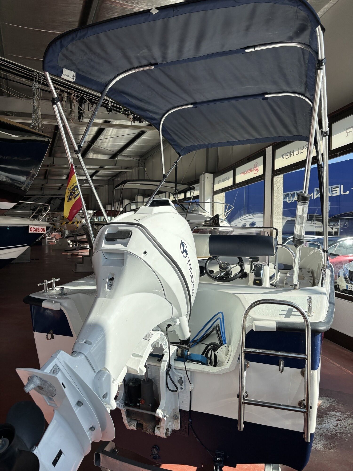 Equipa motor nuevo a estrenar, marca Tohatsu de 50cv con power trim y dirección hidráulica, ofreciendo una navegación suave, cómoda y eficiente. Dispone de amplio solárium en proa, toldo de sol y escalera de baño para máximo confort a bordo.